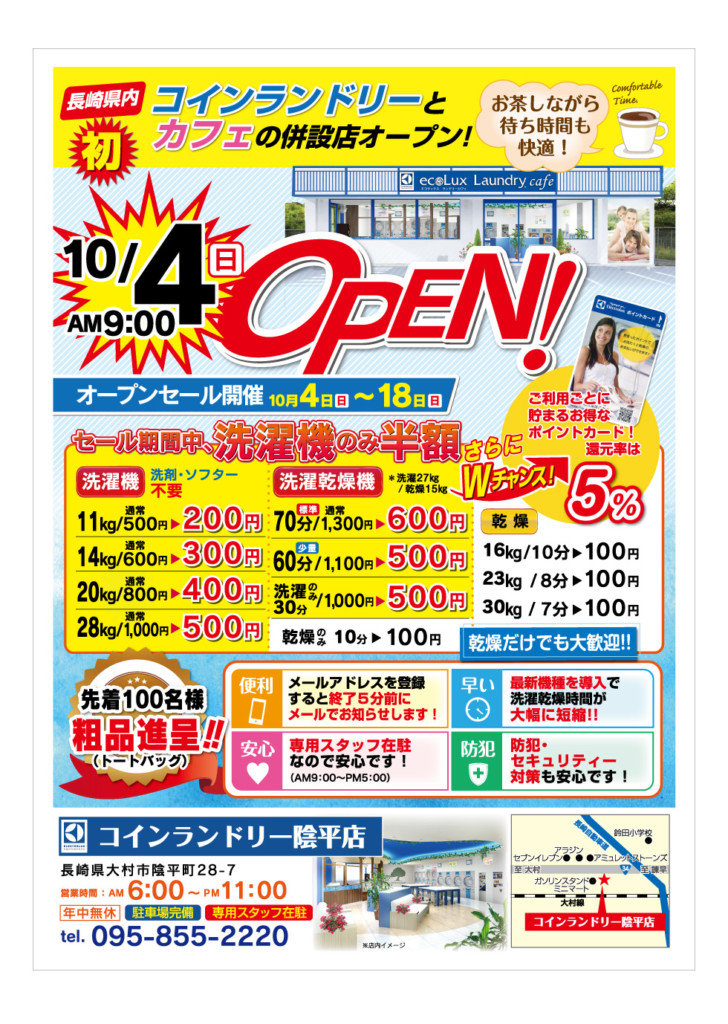 コインランドリー陰平店様B4オープンチラシをデザイン2015.06.08By Business/飲食 チラシ・フライヤー コインランドリー陰平店様B4オープンチラシをデザイン制作しました。Summary案件概要お客様名コインランドリー陰平店お客様住所長崎県大村市制作年月日2015年6月